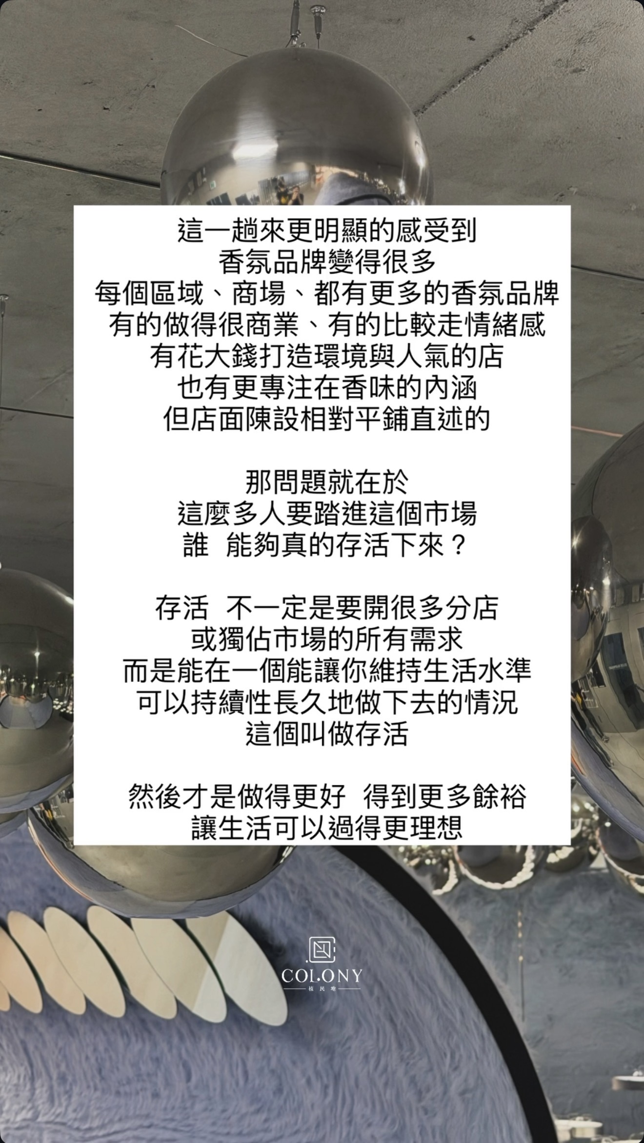這一趟去了首爾 更明顯的感受到 香氛品牌變得更多 每個區域、商場、景點 都有更多的香氛品牌 有的做得很商業,有的比較走情緒感 有花大錢打造環境與人氣的店面 也有更專注在香味的內涵,但店舖陳設相對平鋪直述的 那這麼多品牌就會帶來一個問題 這麼多人都要踏進這個市場,誰能夠真的存活下來? 所謂存活 不一定是要開很多分店,或獨佔市場的所有需求 而是能在一個讓你維持生活水準,持續性長久的做下去的情況 這個叫做存活 然後才是做得更好 得到更多餘裕 ,讓生活可以過得更理想 老實說 在這麼多品牌逛下來,時不時會